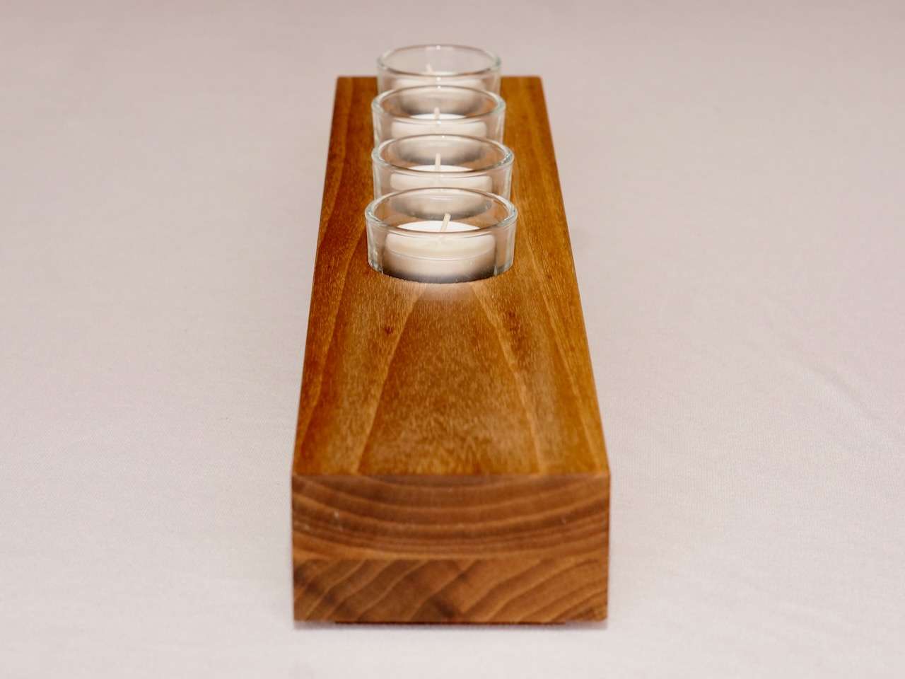 Die vier Bohrungen sind passgenau für die mitgelieferten Glashalter gefertigt. Standard-Teelichter bis ca. 40 mm Durchmesser finden darin sicher Platz. Dank der klaren Gläser kommt sowohl das Kerzenlicht als auch die Maserung des Nussholzes perfekt zur Geltung. Der Teelichthalter wird von Hand gefertigt und mit hochwertigem Kräuterfirnis geölt – für eine seidig-matte Oberfläche, die sich angenehm anfühlt und die natürliche Farbe des Holzes hervorhebt.