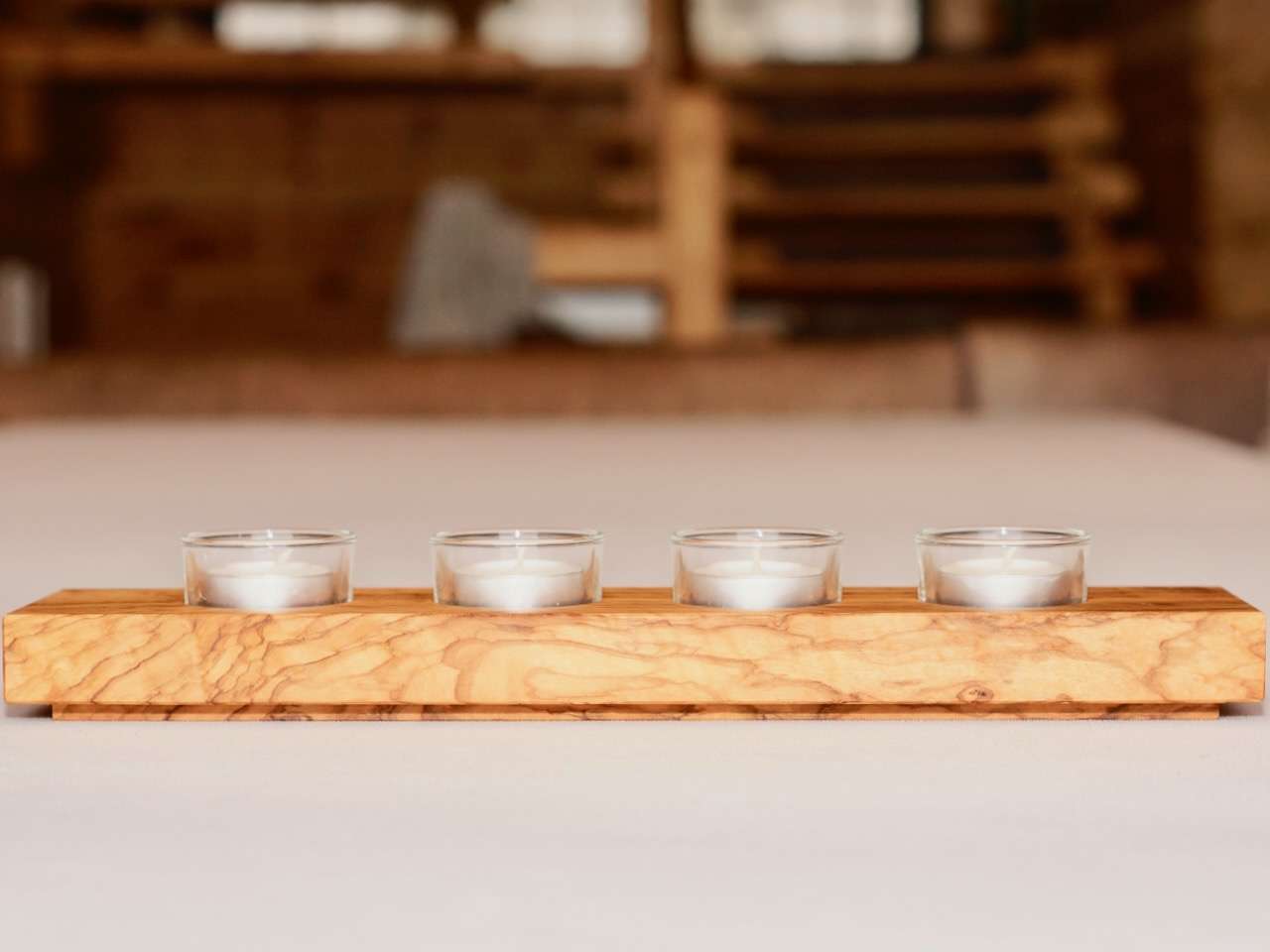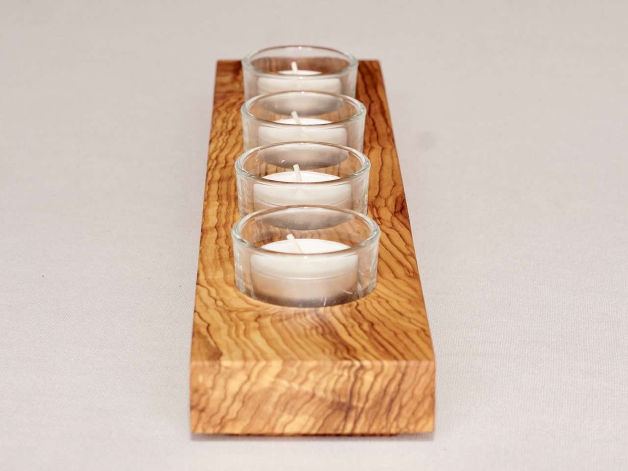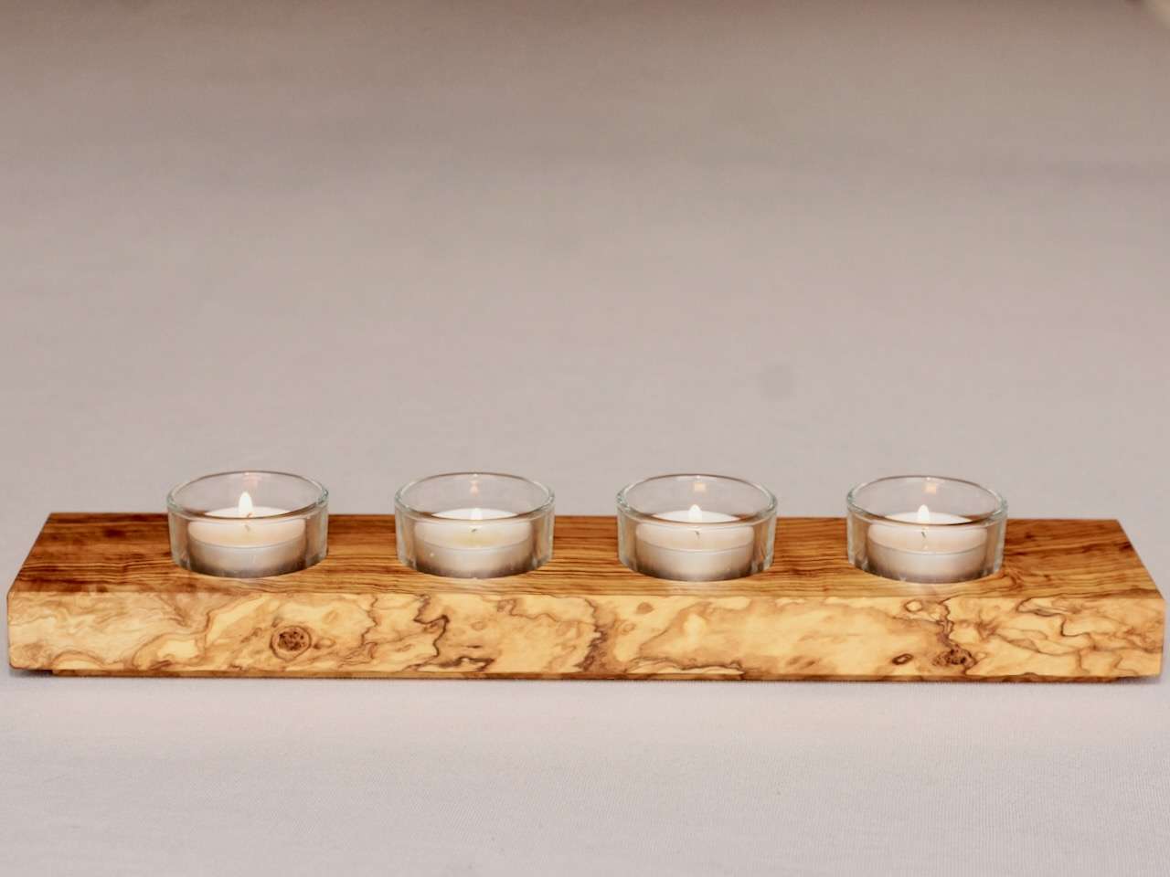 Ob als edle Tischdeko, mediterranes Highlight im Wohnzimmer oder als moderner Adventskranz aus Olivenholz mit vier Teelichtern – dieses Stück ist immer ein Blickfang und eignet sich auch hervorragend als besonderes Geschenk.